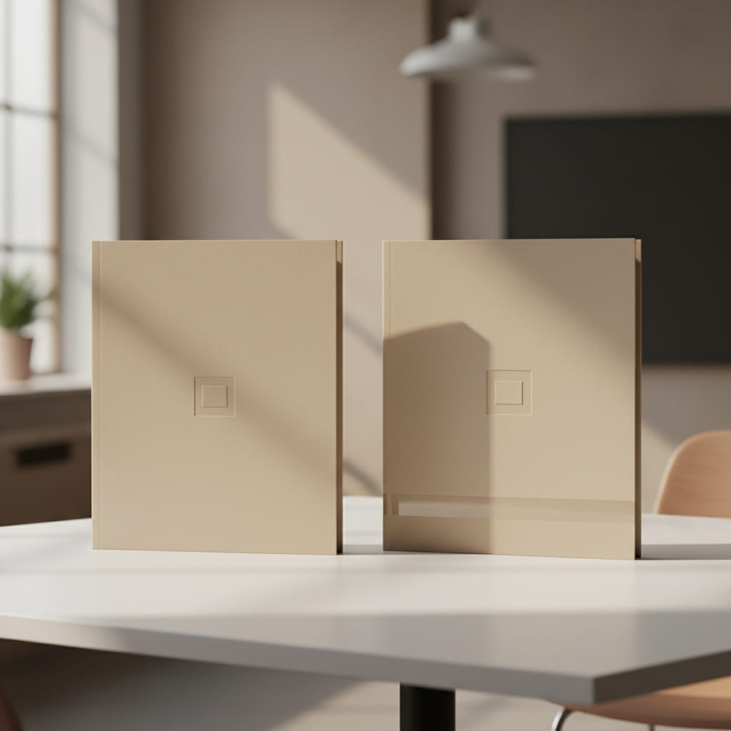 Kits executivos personalizados, embalagens rígidas premium e pastas institucionais diferenciadas podem reforçar autoridade e profissionalismo. Além disso, materiais com acabamento superior tendem a ser guardados por mais tempo.