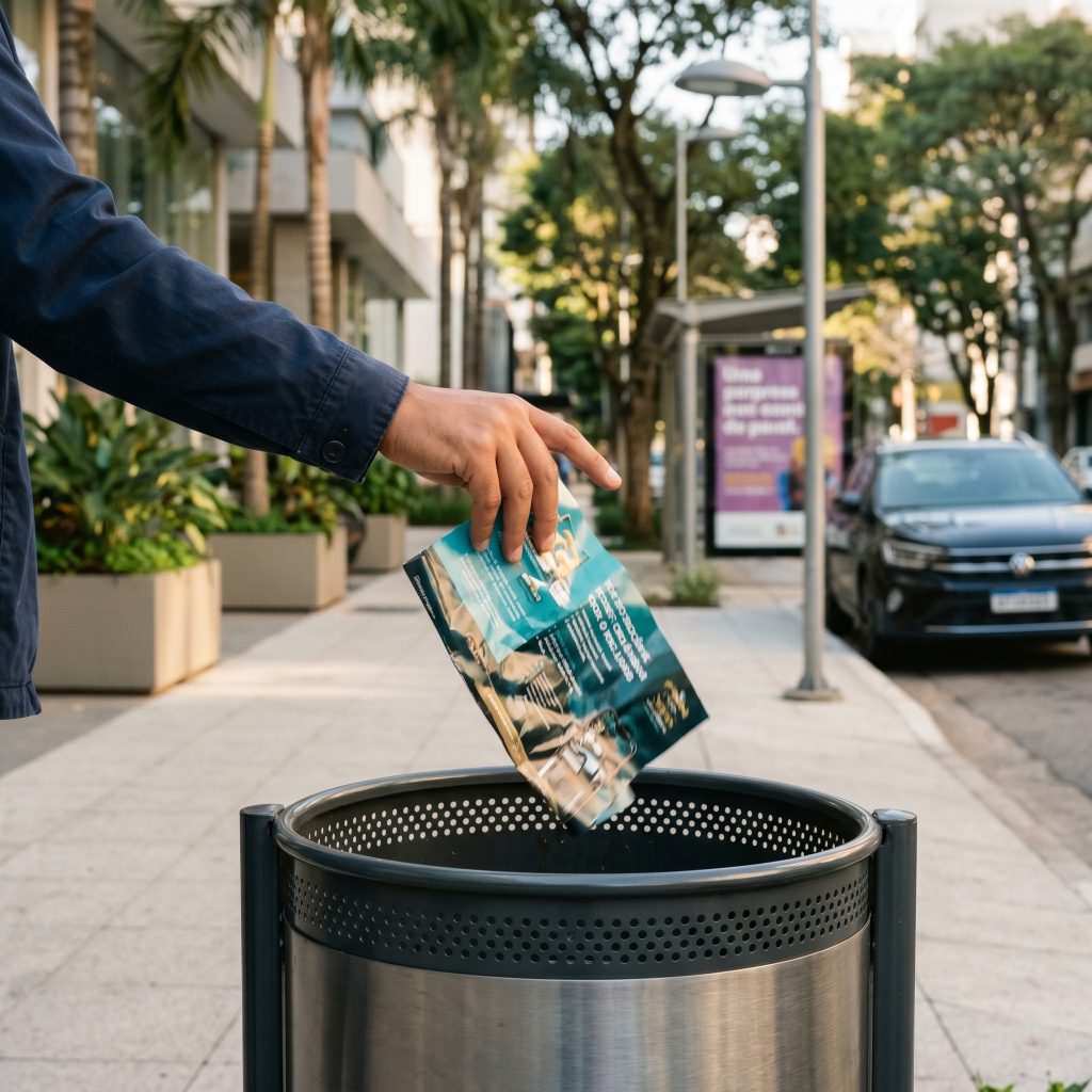 No entanto, esse impacto costuma ser passageiro. Em muitos casos, o panfleto é descartado logo após o primeiro contato.